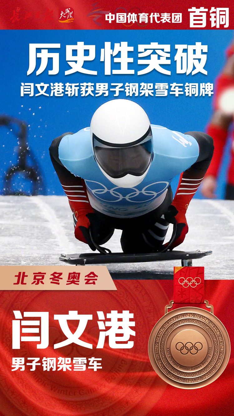 11日晚,在北京冬奥会男子钢架雪车第4轮比赛中,中国选手闫文港获得铜牌,中国钢架雪车创造历史。详见>>>