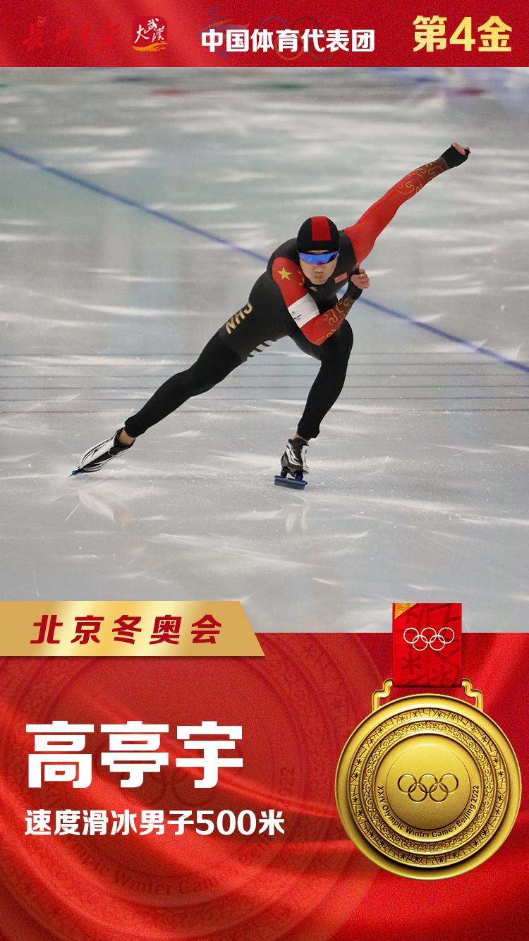 2月12日,北京冬奥会速度滑冰男子500米决赛,中国体育代表团开幕式旗手高亭宇以34秒32的成绩打破冬奥会纪录获得金牌,为中国代表团夺得本届冬奥会的第4金。详见>>>
