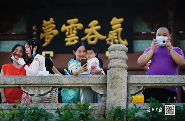 游客在黄鹤楼前拍照留念。长江日报记者何晓刚 摄
