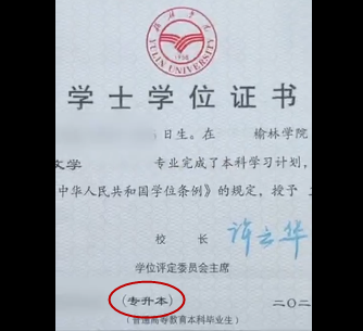 陕西榆林学院吴同学今年专升本毕业,学位证书上被标注了“专升本”三个字,她认为被歧视。校方回应称,这是省里统一要求的。