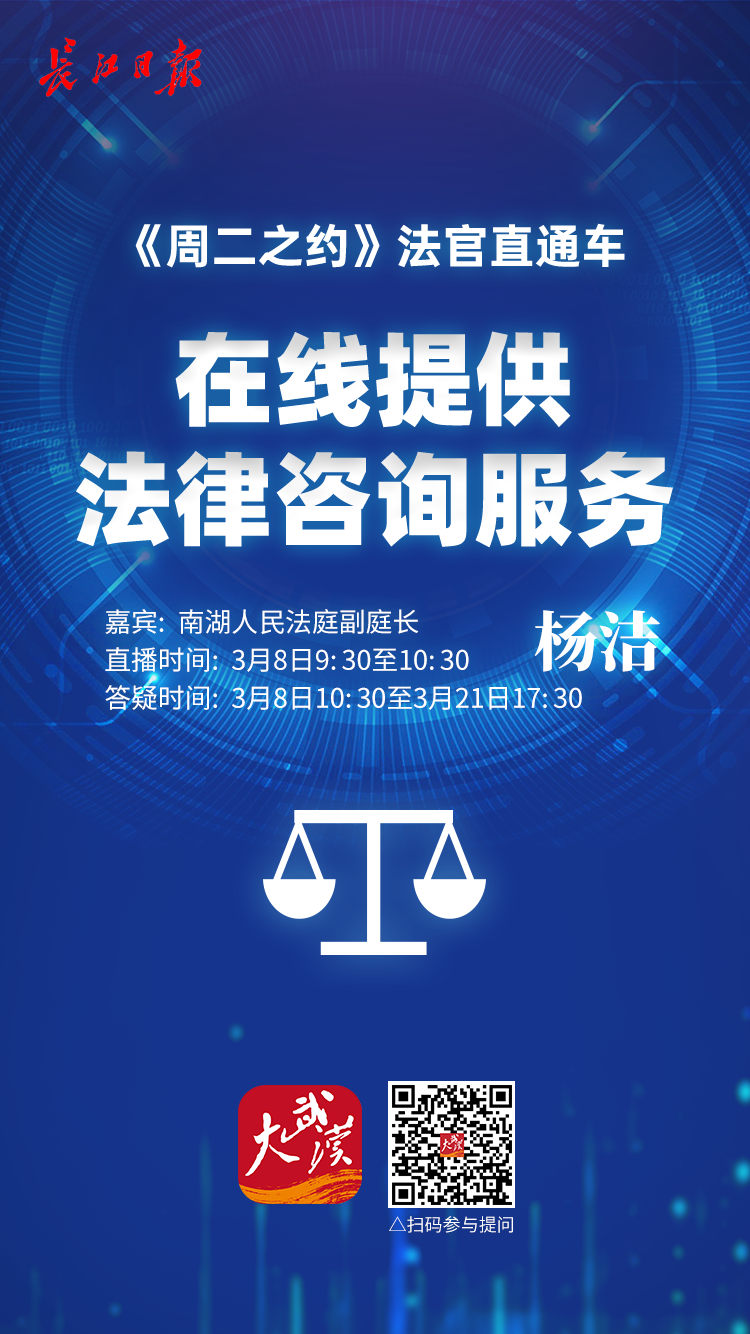 3月8日上午9时30分至10时30分,武汉市洪山区南湖人民法庭副庭长杨洁做客本报“周二之约”直播间,为群众解答房屋买卖纠纷问题。