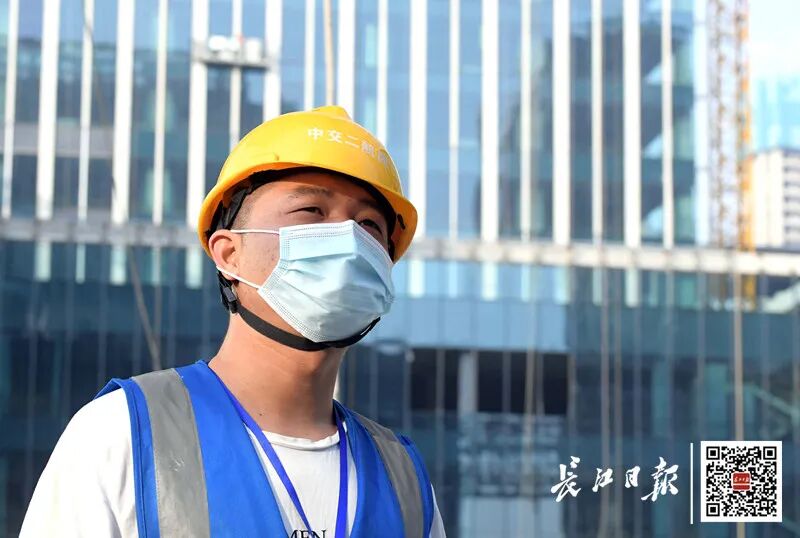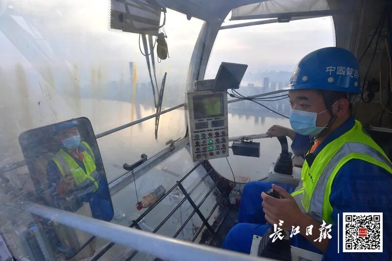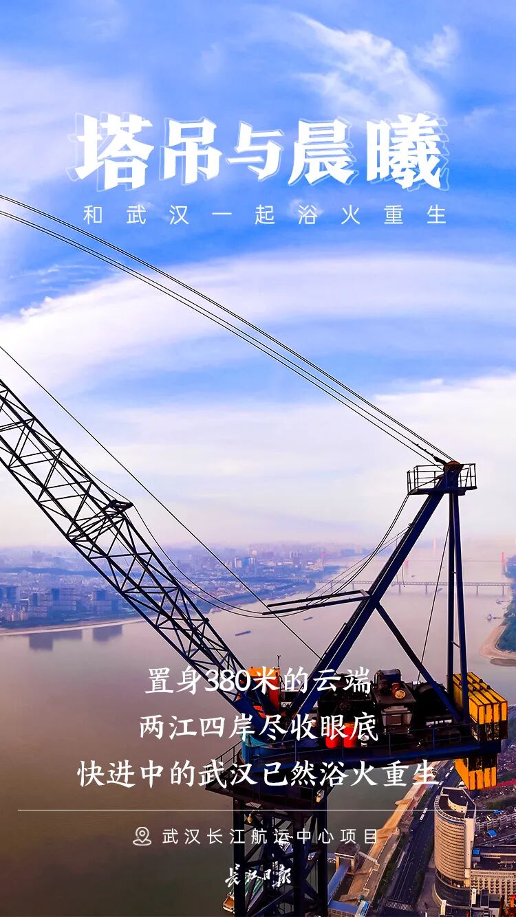 同一时刻,汉口沿江大道上,武汉长江航运中心项目1号楼主楼正在进行屋顶钢结构安装。同样是“90后”的塔吊司机李康祥迎着朝阳,乘坐工程电梯直达62层,然后登上336米高的屋顶,身手矫健地爬上一座40多米高的塔吊。他工作的地方在380米高空,置身于云端之中,长江两岸尽收眼底。