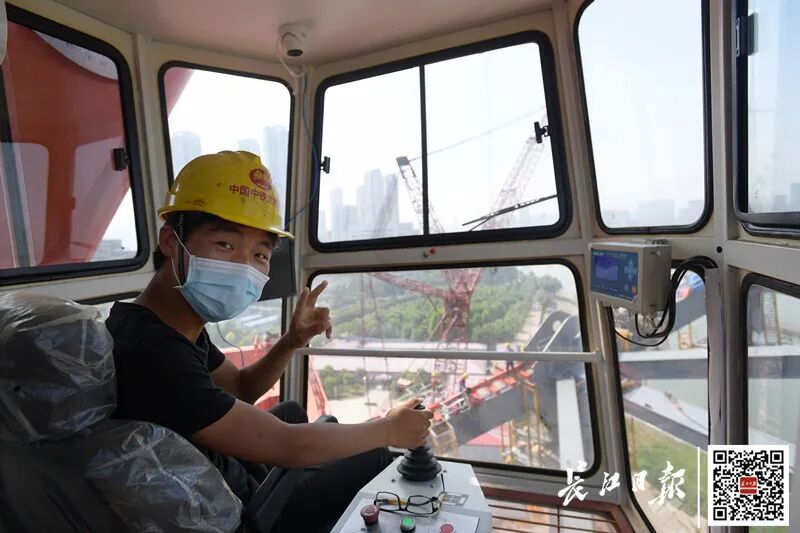 吊梁司机、“00后”小伙子唐豪随人群走进江汉七桥汉口岸工地。晨光中,他操作着国内首次应用新技术研制的一台重载大角度爬坡100吨架梁吊机,操纵摇杆不断运送架桥的各种杆件和轨道。
