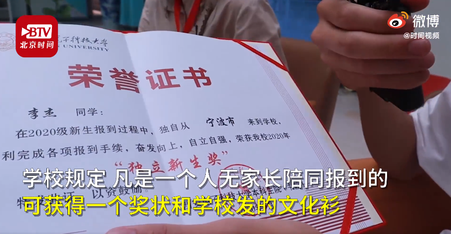 西安电子科技大学一高校设立“独立新生奖”,鼓励新生一个人来报到。学校规定,凡是学生一个人无家长陪同报到的,可获得一个奖状和学校发的文化衫,得到了很多学生和家长的积极响应。