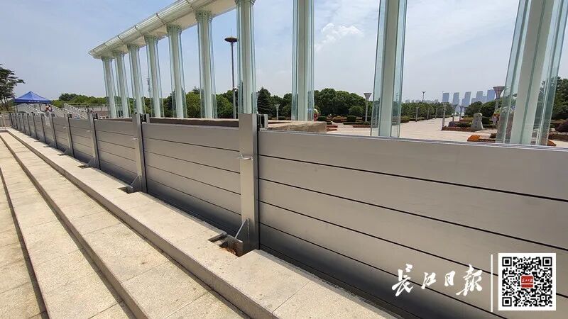 ◇ 27日,汉口沿江大道滨江门闸口的一座拼装式防洪墙正在进行实地闭水实验,高强度铝合金材质作挡板,安装简单,还可在非汛期拆掉。