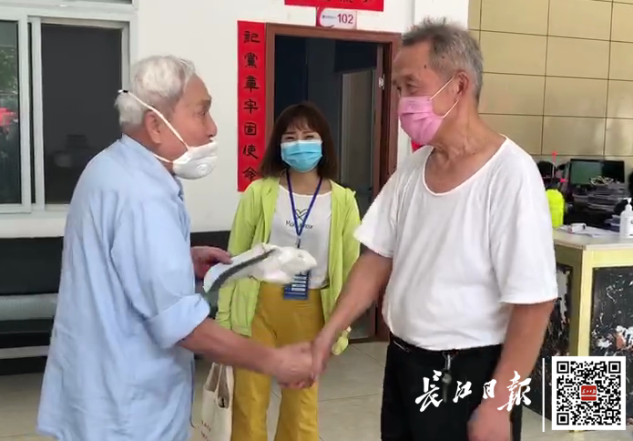 27日下午,两位老人时隔4个月终于再次相见,社区大厅内回荡着两人爽朗的笑声。