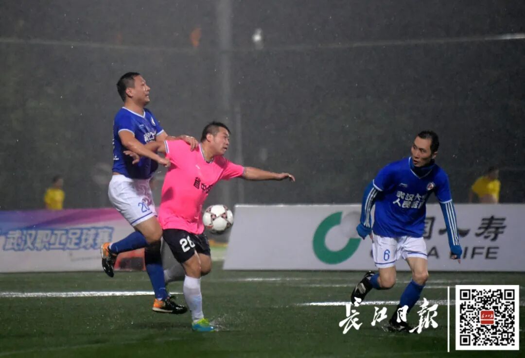 ◇ 20日,2020“长江杯”第三届武汉职工足球赛小组第二轮继续进行,球员在雨中展开激烈角逐。