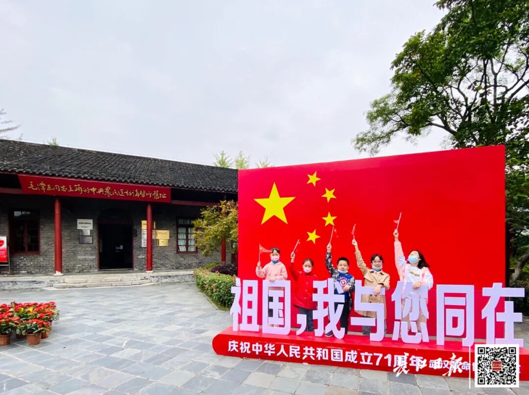 青少年游客在农讲所门前的国旗背景前拍照留念。