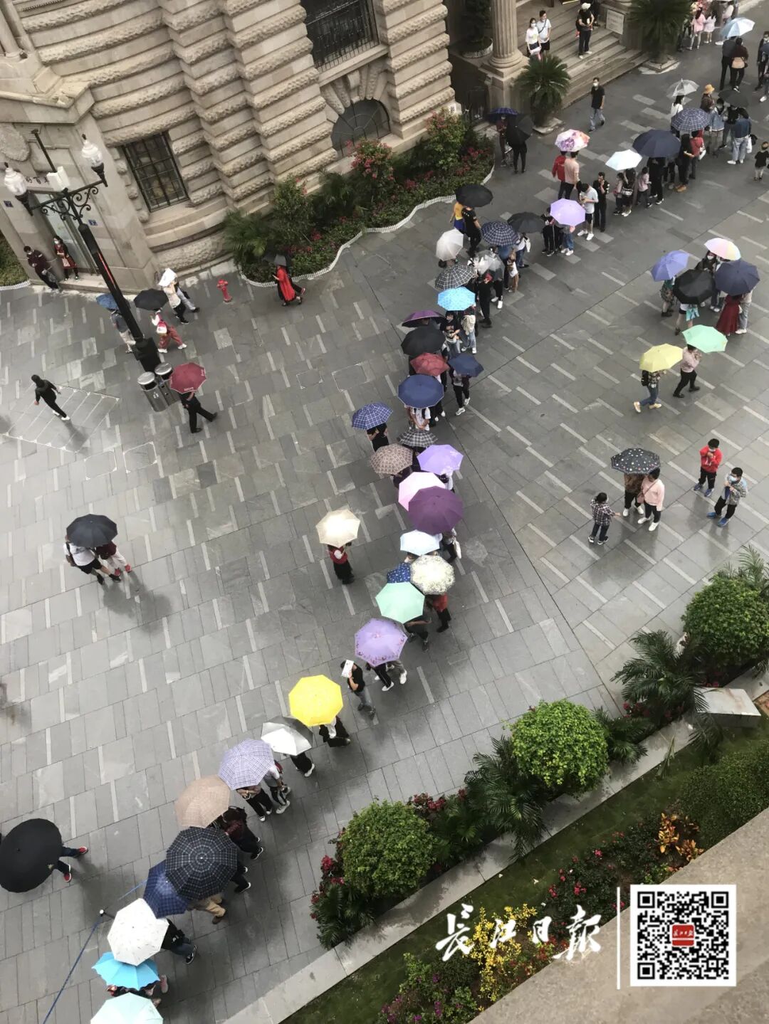 江汉关博物馆入口,众多游客冒雨参观。