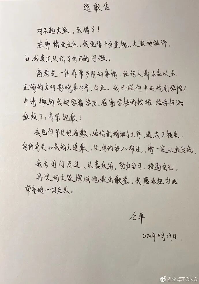 近日,艺人仝卓在直播中自曝,将往届生身份改为应届生参加高考。昨日,教育部要求对弄虚作假等违规行为追查到底。昨晚,仝卓公开道歉,并主动申请撤销中戏学籍,愿承担一切后果,你怎么看?
