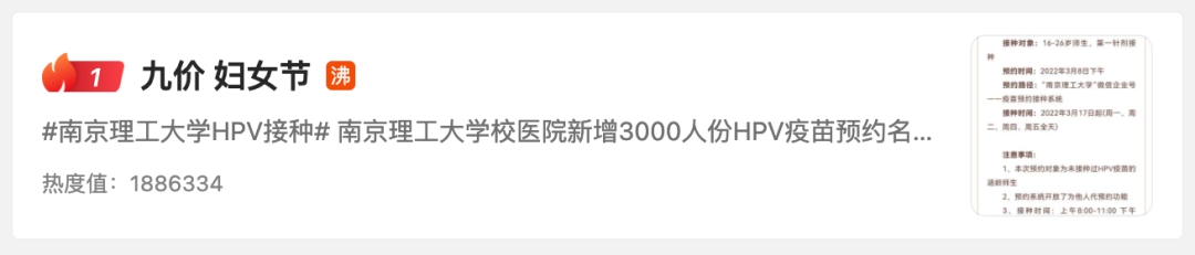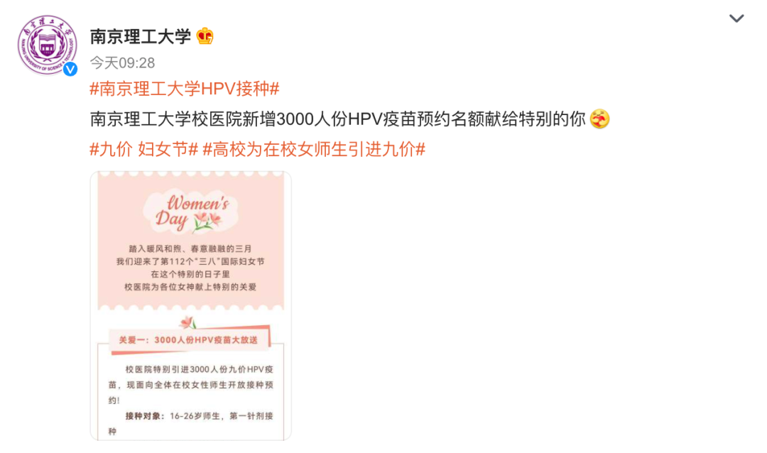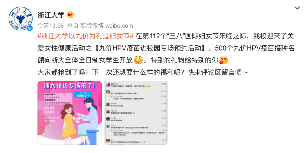 为庆祝妇女节,浙江大学迎来了关爱女性健康活动之九价HPV疫苗进校园专场预约活动。南京理工大学也引进3000人份九价HPV疫苗,面向全体在校女性师生开放接种预约。