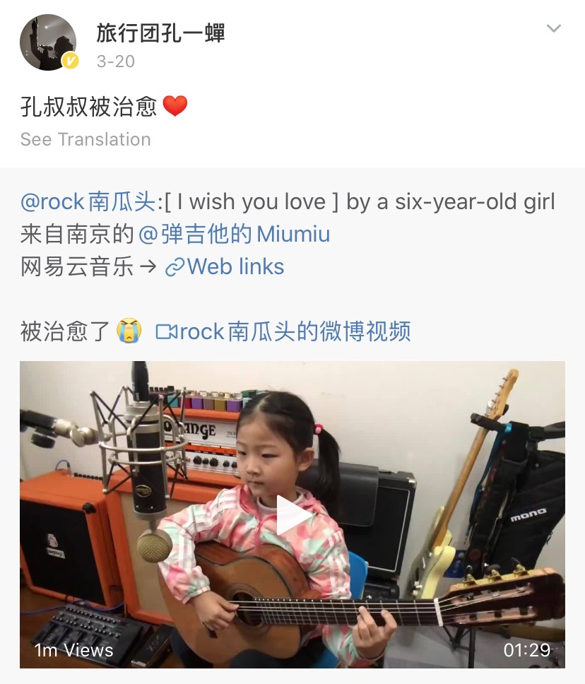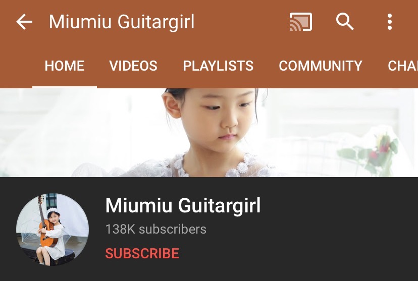 近来,南京一个网名叫Miumiu的6岁女孩因为弹吉他火到国外,从2月份在Youtube上传第一支视频以来,她的吉他弹唱视频获得了超过百万点赞,频道目前有13.8万的订阅量。