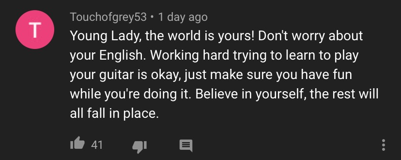 如果音乐还不足以让你爱上她,那你要知道她的性格也很棒。她YouTube频道上的每一段视频都会配上这样的话:“谢谢你的鼓励。我将继续努力学习,实现我成为一名优秀吉他手的梦想。”