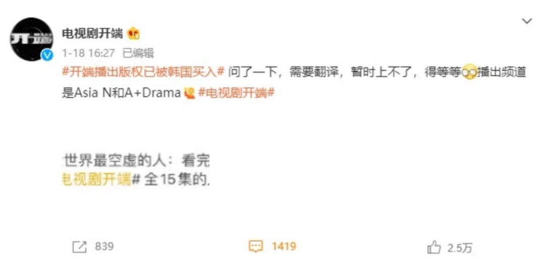 不久,电视剧官博就官宣准备出口韩国。