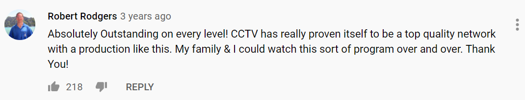 Absolutely outstanding on every level! CCTV has really proven itself to be a top-quality network with a production like this. My family & I could watch this sort of program over and over. Thank You!
