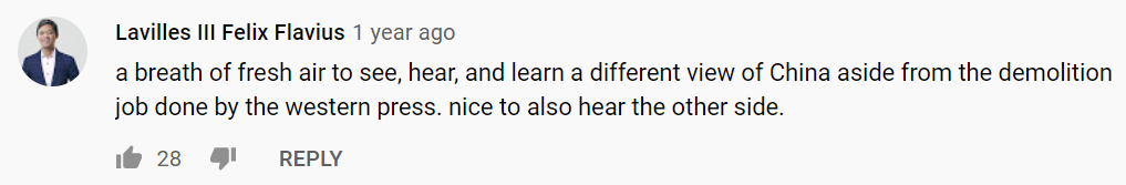 A breath of fresh air to see, hear, and learn a different view of China aside from the demolition job done by the western press. Nice to also hear the other side.