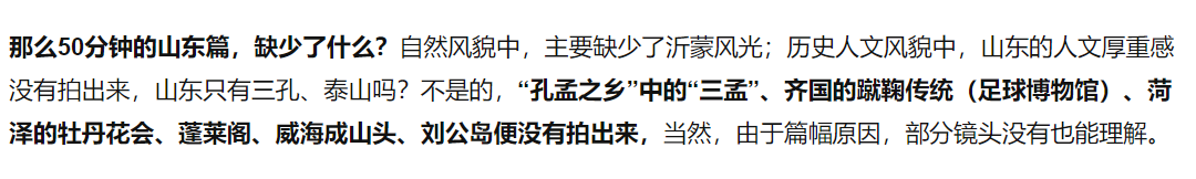 那么50分钟的山东篇,缺少了什么?自然风貌中,主要缺少了沂蒙风光;历史人文风貌中,山东的人文厚重感没有拍出来,山东只有三孔、泰山吗?不是的,“孔孟之乡”中的“三孟”、齐国的蹴鞠传统(足球博物馆)、菏泽的牡丹花会、蓬莱阁、威海成山头、刘公岛便没有拍出来,当然,由于篇幅原因,部分镜头没有也能理解。