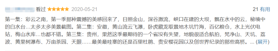 第一集:彩云之南,第一季那种震撼的美感回来了,日照金山,深谷激流,峡口在建的大坝,飘在水中的云,秘境中的白水台……太多太多美景截图。第二集:安徽,黄山流云飞瀑,卧虎藏龙取景地木坑竹海,百亿粮仓,水上光伏电站,梅山水库……也都不错。第三集:贵州,果然这季最期待的一个省没有失望,地貌很适合航拍,梵净山、天坑、荔波、黄果树瀑布、万亩茶园、天眼……最美最哇塞的还是百里杜鹃、贵安樱花园以及创世界纪录的那些高桥。