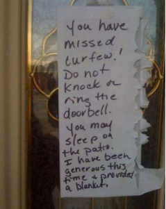 You have missed curfew! Do not knock or ring the doorbell. You may sleep on the patio. I have been generous this time and provided a blanket.