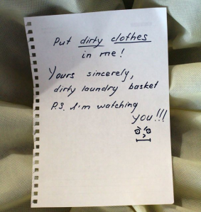 请把脏衣服放到我里面来。此致,你的脏衣篓。PS. 谁的小眼睛,还没看我!