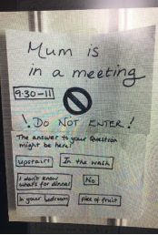 Mum is in a meeting. 9:30-11:00. Do Not Enter! The answer to your question might be here: upstairs, in the wash, I don’t know what’s for dinner, No, in your bedroom, piece of fruit.