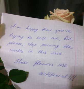 I’m happy that you’re trying to help me, but, please, stop pouring the water in this vase. These flowers are artificial.
