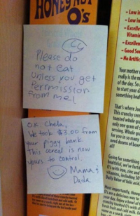 OK, Chela. We took $3 from your piggy bank. This cereal is now yours to control. Mama and Dada.