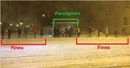 就拿个简单的说:私人空间。芬兰人非常尊重彼此的私人空间。你可能已经看过这张关于芬兰人在公共汽车站等车的照片了,真的很有趣。