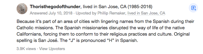 也有许多外国网友在美版知乎Quora发问:Why is San Jose pronounced as San Hose?