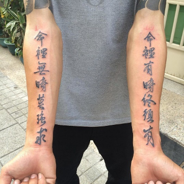 另外一派汉字文身就会文中国思想家们的名言。比方说老子和孔子。他们的智慧结晶在今天同样闪光,很快就能引起普罗大众的共鸣。