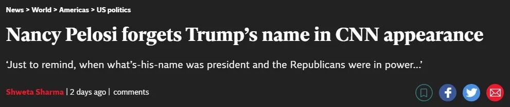 此事一出,媒体报章普遍在标题里就定性说这是佩洛西不小心忘记了特朗普的名字。相反,网民们的理解却不同,有人回复:
