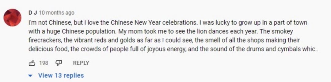 My mom took me to see the lion dances each year. The smokey firecrackers, the vibrant reds and golds as far as I could see, the smell of all the shops making their delicious food, the crowds of people full of joyous energy, and the sound of the drums and cymbals which you could feel throughout your entire body.