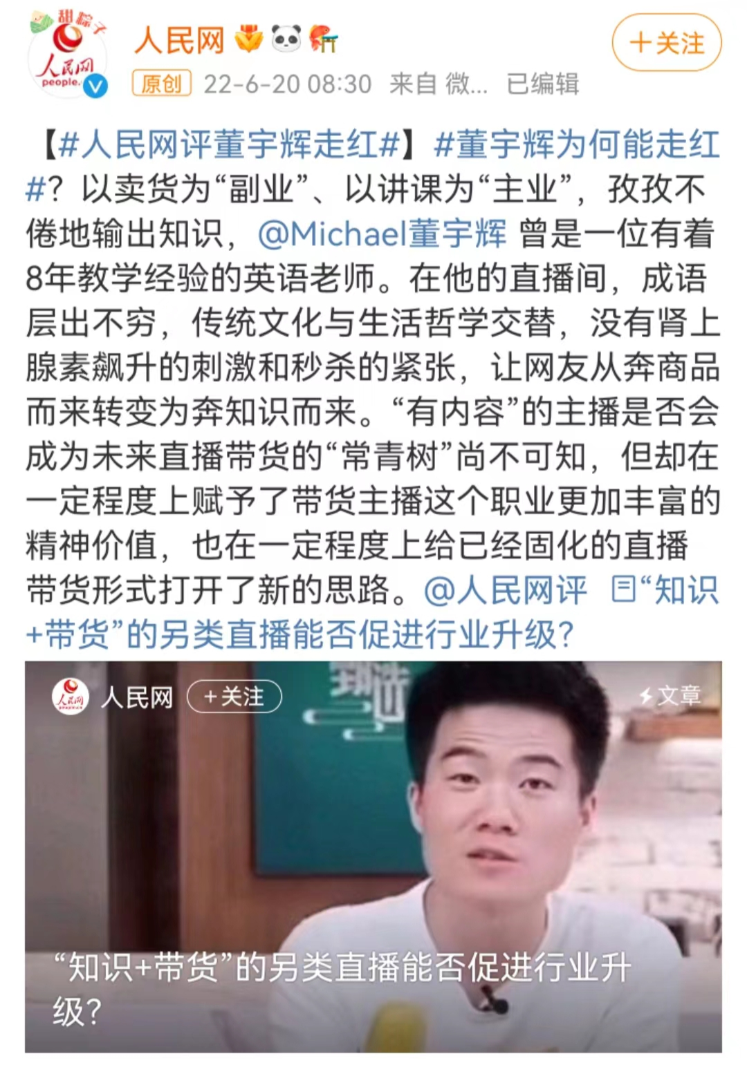 6月20日,#人民网评董宇辉走红#冲上热搜,顺带提出了“知识+带货”的另类直播模式能否促进行业升级的社会议题。