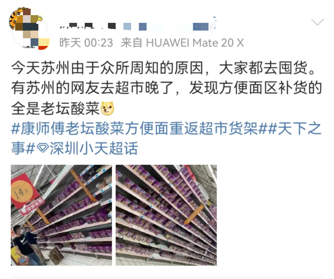 其实,不仅是在昆明,有博主爆料,受疫情影响,在苏州很多消费者都去超市囤货,他去晚了,发现超市补货上架的都是康师傅老坛酸菜面。