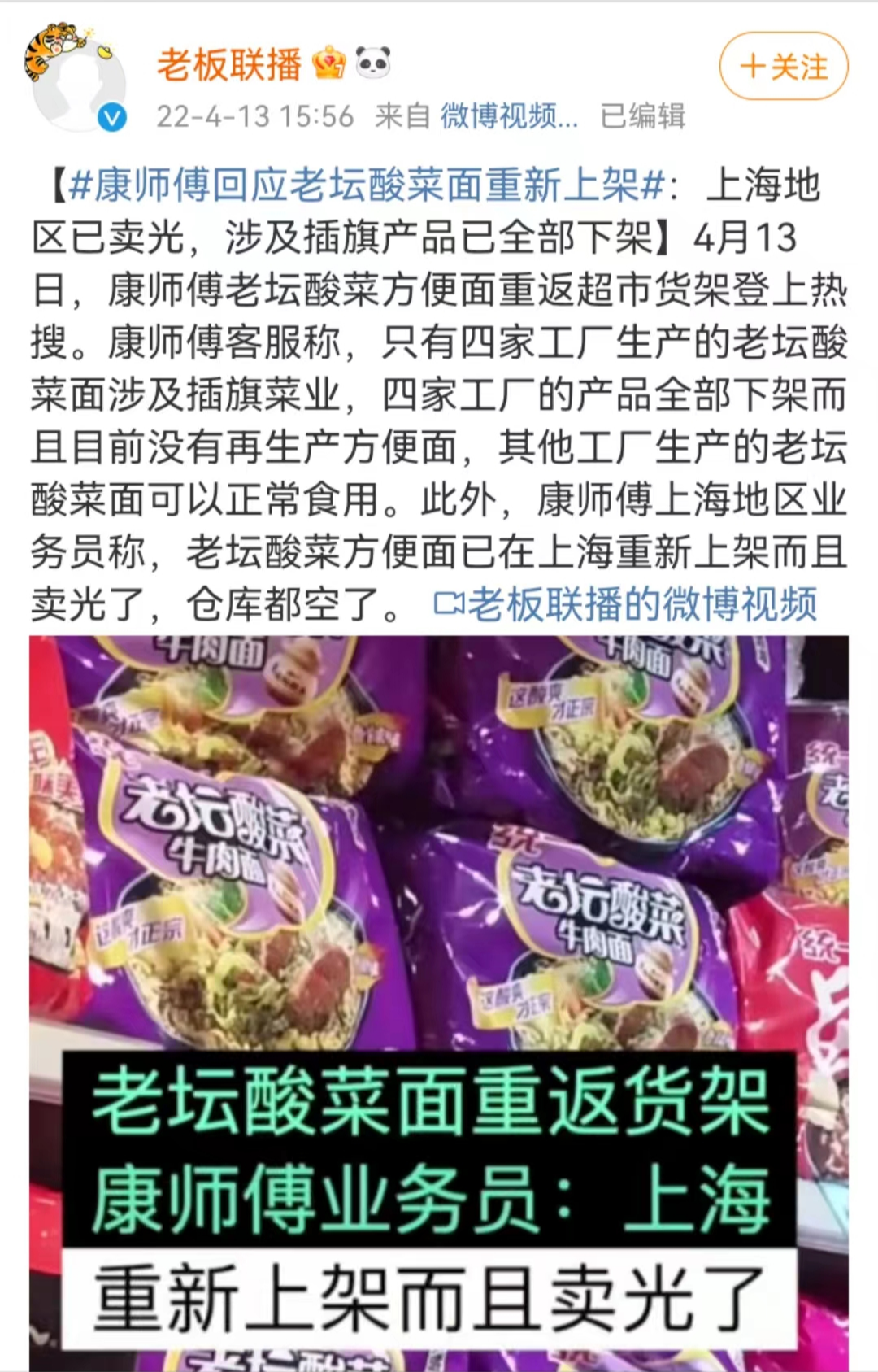 据康师傅的业务员透露,在上海重新上架的老坛酸菜面,已经卖空了。