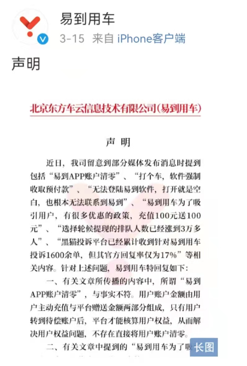 面对“退款难”“要倒了”等质疑声,易到用车在315当天做出了长图回应。