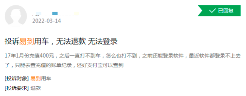 在黑猫投诉平台,关于易到的投诉高达1600条。基本集中在App无法登陆、无法退款等问题上。