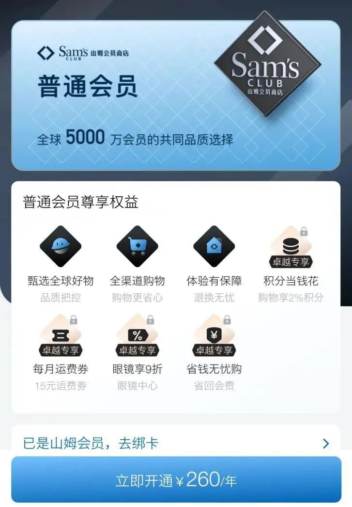 山姆的会员卡分为两种:260元的基础卡和680元的卓越卡。