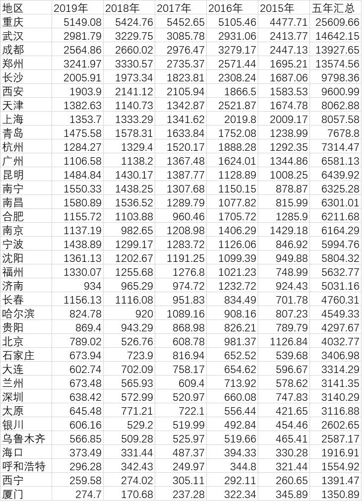 这5个城市分别是重庆、郑州、武汉、成都和长沙,均为来自中西部的强省会或直辖市。