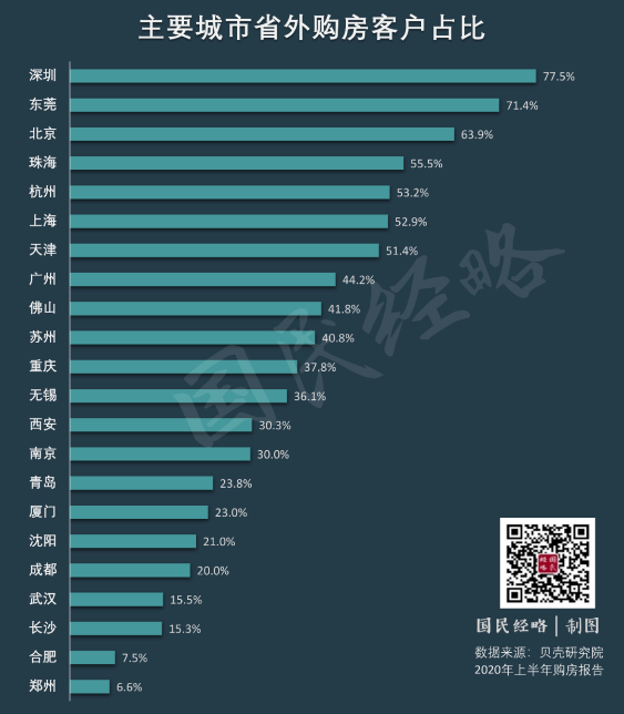 就拿刚才人口净流入都是二十多万的长沙和杭州来说,杭州省外购房比例客户达到53%,而长沙只有15%,从这个角度看杭州城市的含金量就要远超长沙。