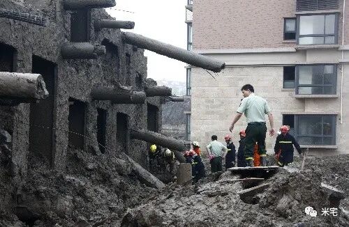 据现场照片显示,在倒塌大楼的底部,地基桩体散落一地。这些桩体基本为圆柱形的,有些是实心的,有些则为空心,很可能在基础工程阶段就出了问题。