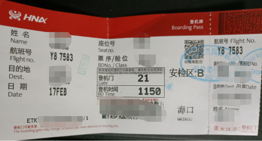 图:本人回程登机牌
