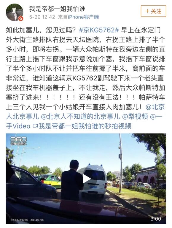 北京也发生过一起奇特的加塞事件。一辆黑色的帕萨特为了变道进入医院,从车上走下一位黑衣男子,直接站在视频车的前方,随后直接做在发动机盖上。然后一旁的帕萨特趁机加塞成功。事件网上曝光后,前车车主致歉并声称当时车上的母亲因病失禁,急着去医院才会选择这样的方式加塞。