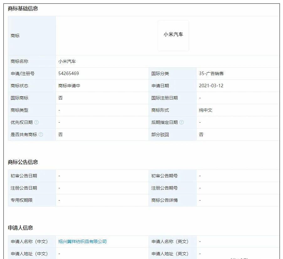 而今年年初,小米汽车刚刚决定投资造车后立刻就有一家名为绍兴翼祥纺织品有限公司的企业强行注册了“小米汽车”的商标,国际分类为广告销售、运输工具。