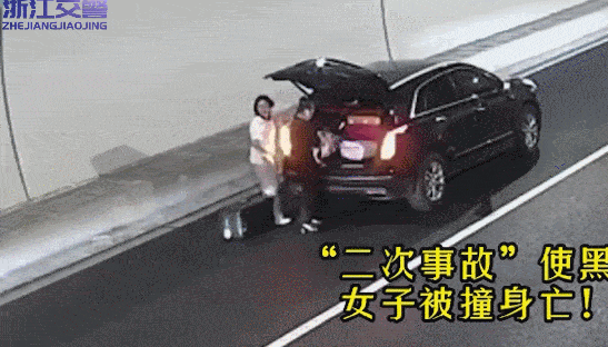 数分钟后,白色SUV车内乘客下车站在了遂道疏散通道上,而黑色SUV的驾驶员此时却在绕车检查损失并到后备箱拿三角警示牌,她似乎并没有注意到自己身处危险之中。