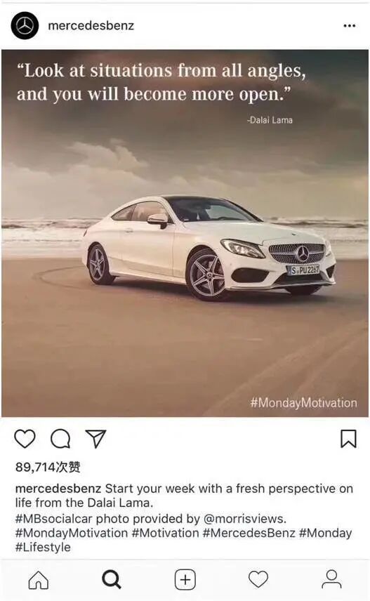 几年前,奔驰在它的ins平台上,发布了一张车图,这没什么问题,重点是画面上方引用了藏独头目达赖喇嘛的一句话:从不同角度审视境遇,你的视野会更广阔。这还不算完,在这条动态的下方,醒目的写着“以达赖喇嘛的全新生活视角开启你新的一周”。显然,这不是失误,运营者都知道这些文字的出处,这是公然的辱华。最后,奔驰删除了该条动态并发布了致歉声明。