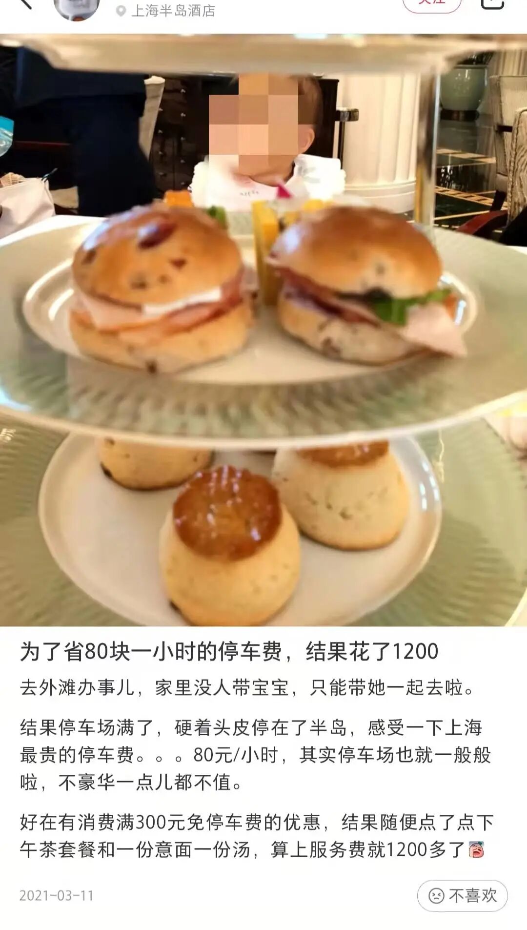 小红书上有个博主曾发了这样一条帖子,带娃去上海外滩,实在找不到停车位,就停到了80元/时的半岛酒店停车场。