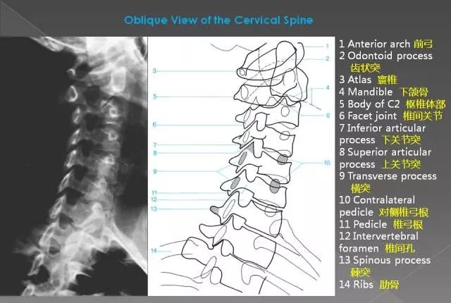 对疑有关节突及峡部病变而正、侧位片显影不清者,应加照左及右斜位片。在斜位片上可清楚的显示一侧上、下关节突及峡部因此峡部断裂、延长、关节突骨折、增生等,皆可清楚显示。
