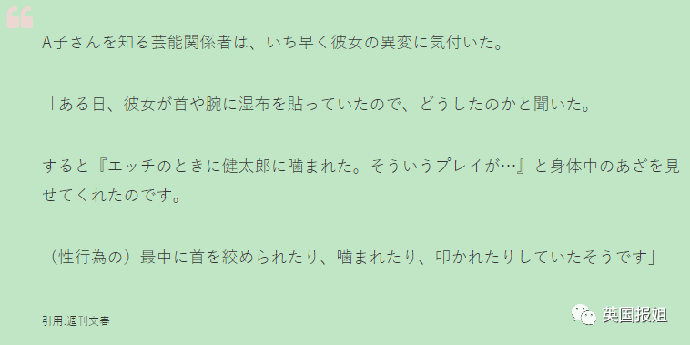 这其实已经很渣了,但还有更过分的事。当时A子演艺圈的朋友发现她身体不对劲,脖子和手臂上总是贴着膏药。后来才知道,这是伊藤健太郎弄的。