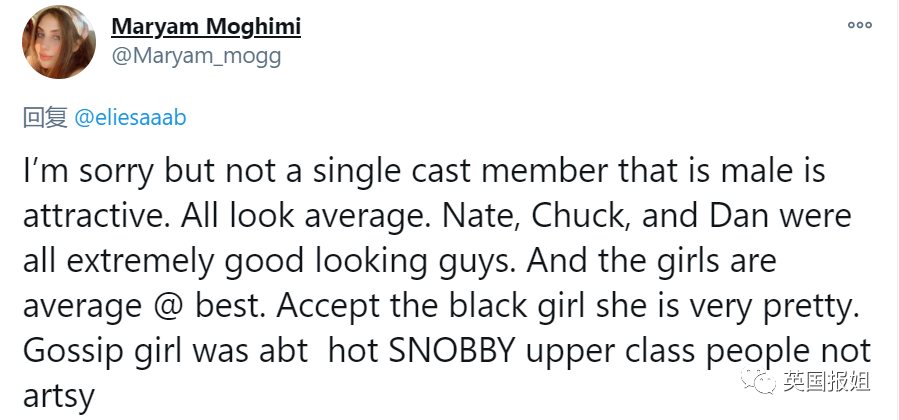 我能接受这个黑人女孩,她很漂亮。《绯闻女孩》是一部关于性感势利的上流社会人们的电视剧,而不是艺术相关。”